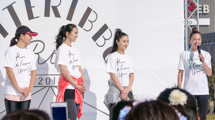 最大拠点のお台場 women’s 会場はゲストも豪華。土屋アンナさんやソウルオリンピックのマラソン銀メダリストのダグラス・ワキウリさん、S.J.K.パーカー/ガーナ共和国特命全権大使、モデルの堂珍敦子さん、立野リカさん、河内セリアさんらをお迎えして盛り上がりを見せました。土屋さんは昨年のWHITE RIBBON RUN の翌日に第 3 子を出産し、2016 年の第 1 回開催以来 2 年ぶりの参加。「一人ひとりが集まって一つの運動をすることが誰かのためになる、ここからがスタートだと思って、いろんな国の女性と子どもたちのことを考えて欲しい」。